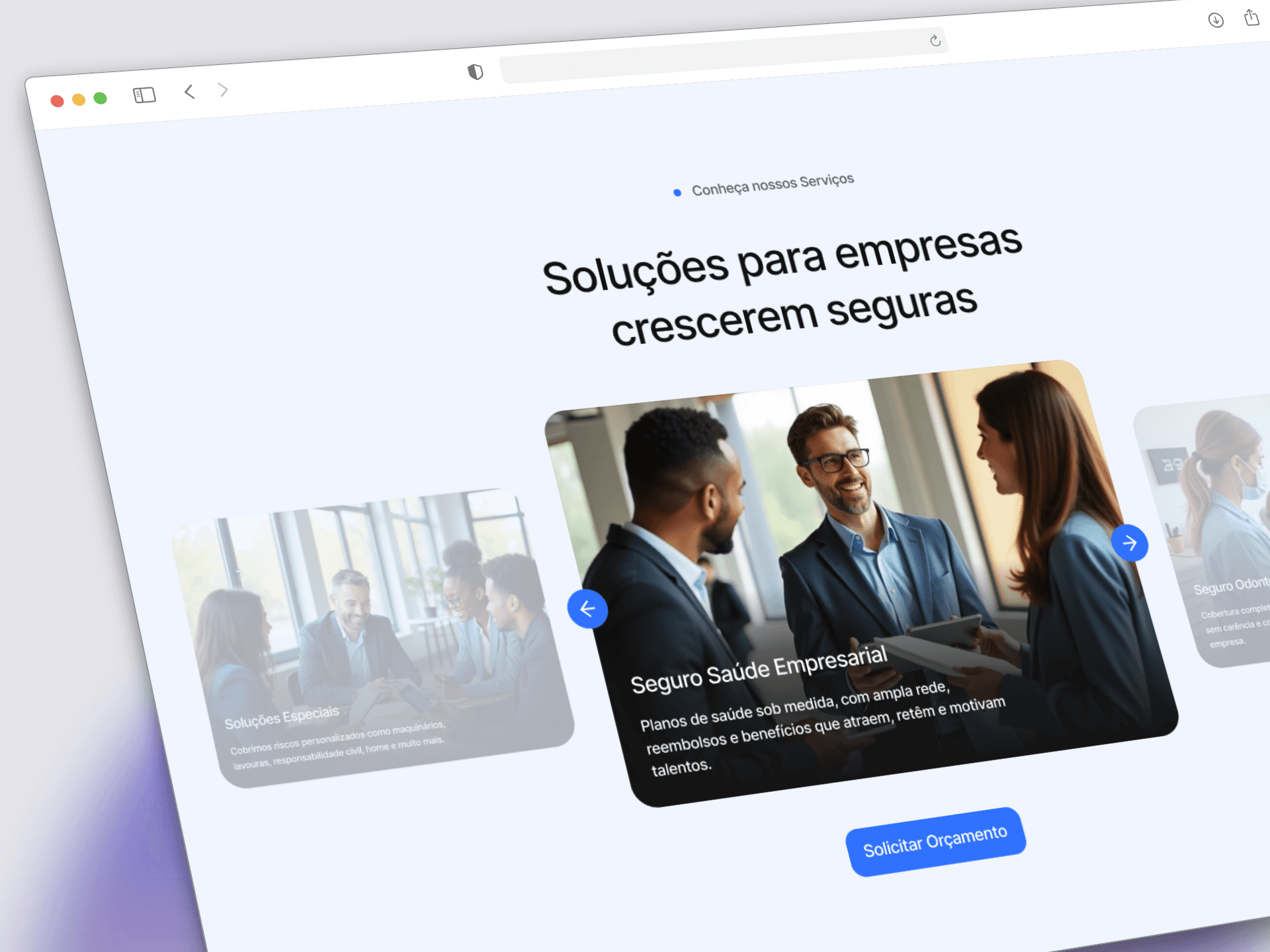 Layout limpo, elegante e focado em transmitir credibilidade no setor de seguros.